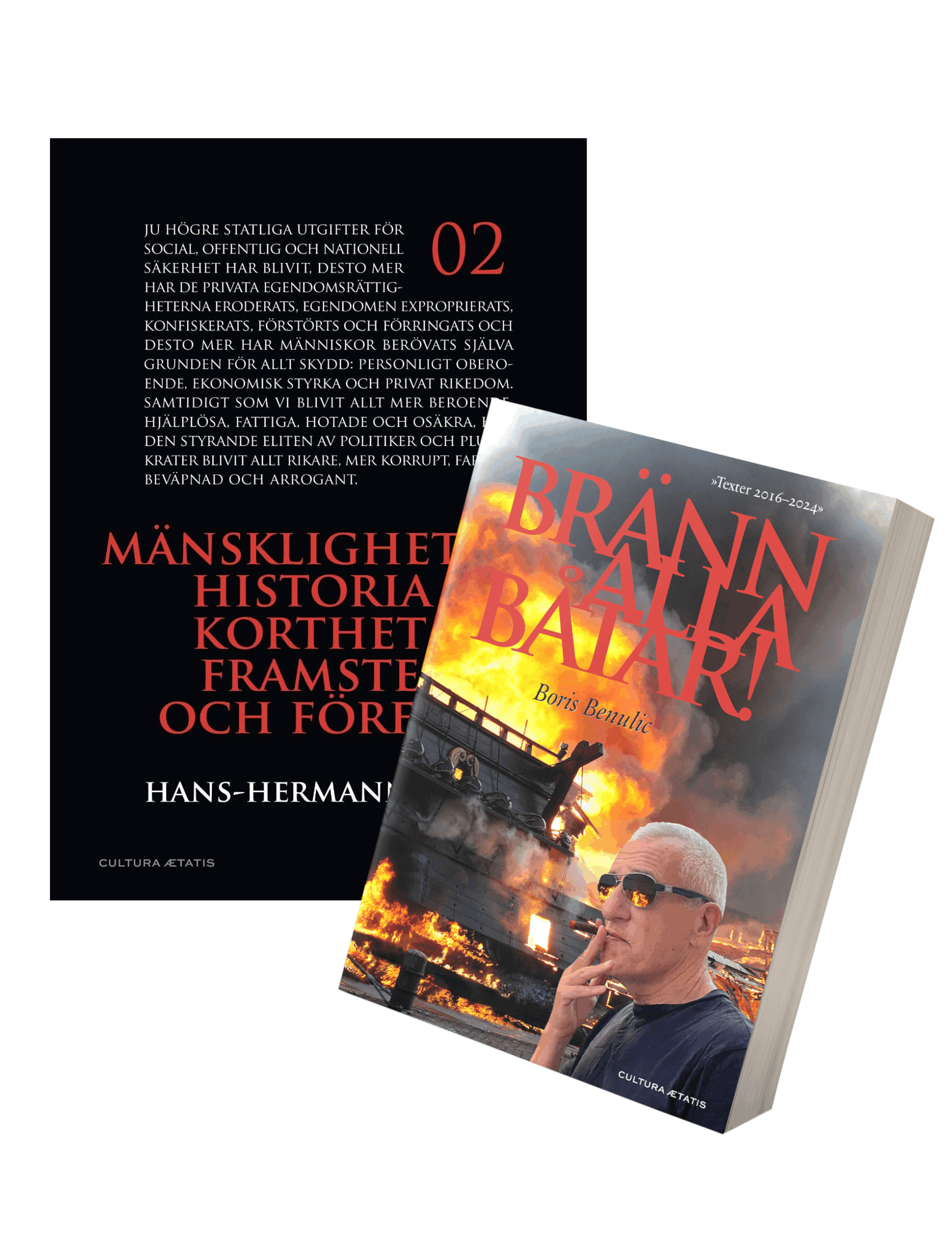 Vi säljer nu ut de sista exemplaren av Hoppes ‘Mänsklighetens historia i korthet – framsteg och förfall’ i ett paket tillsammans med Boris Benulic senaste bok ‘Bränn alla båtar!’.